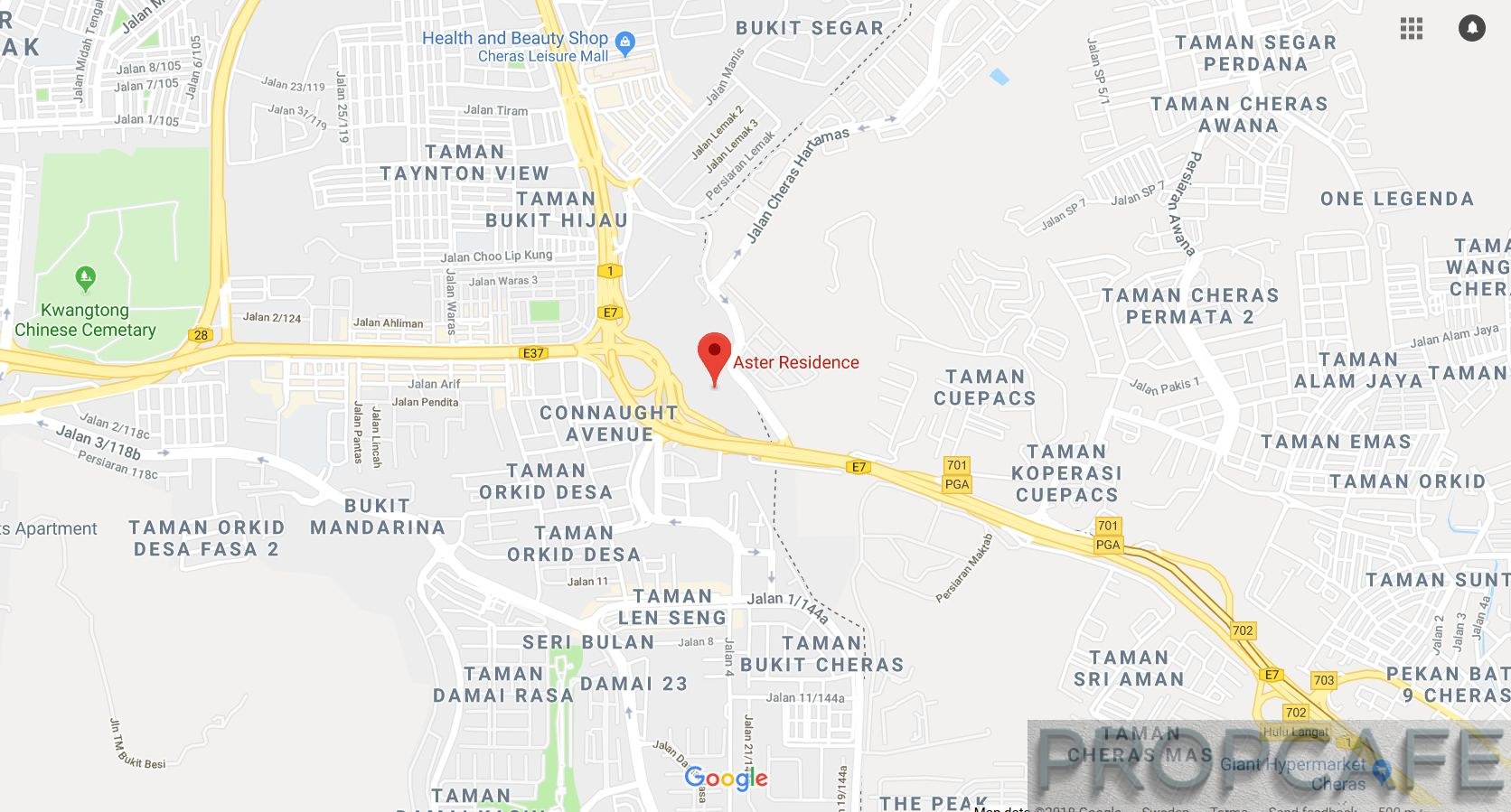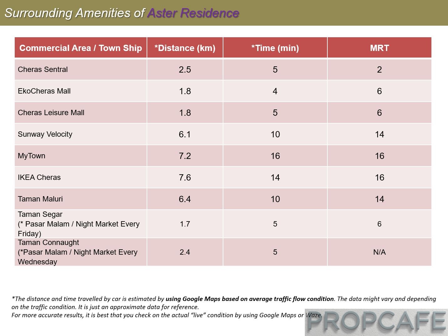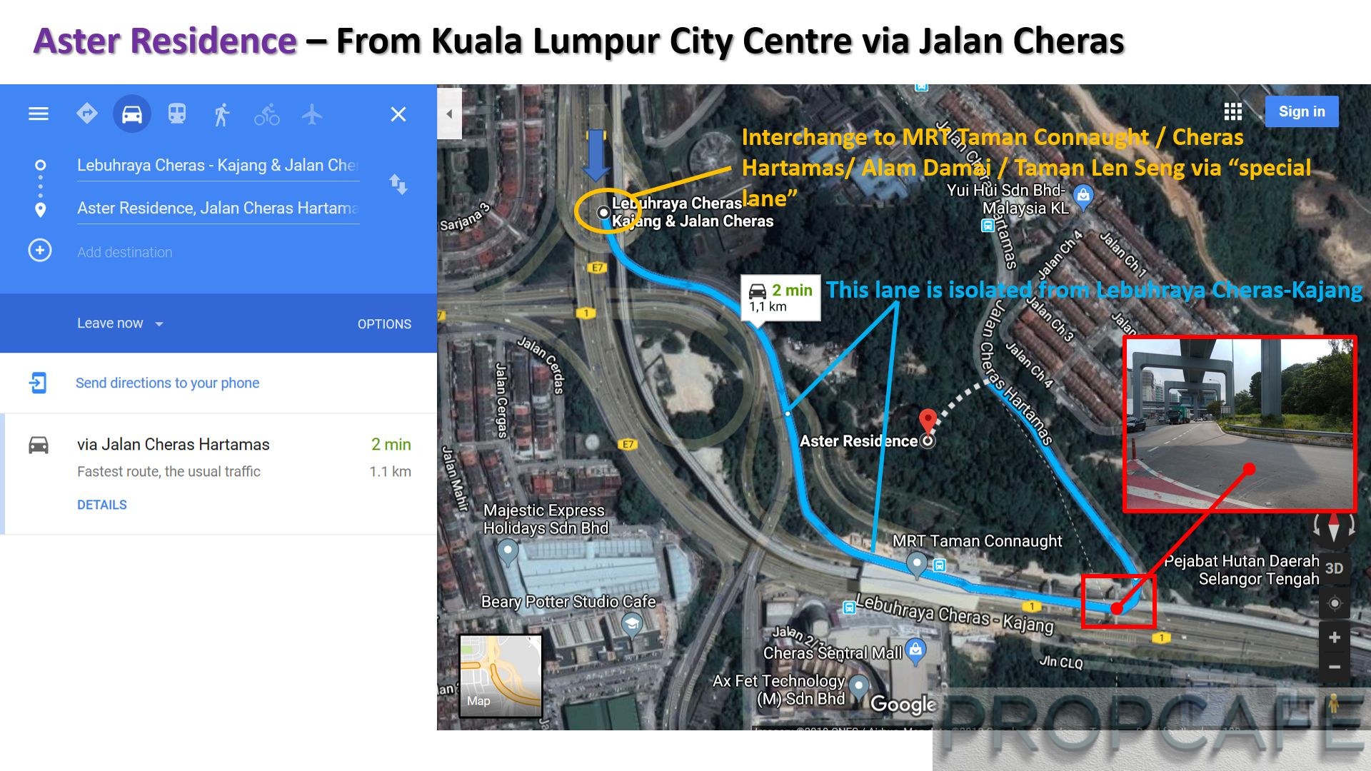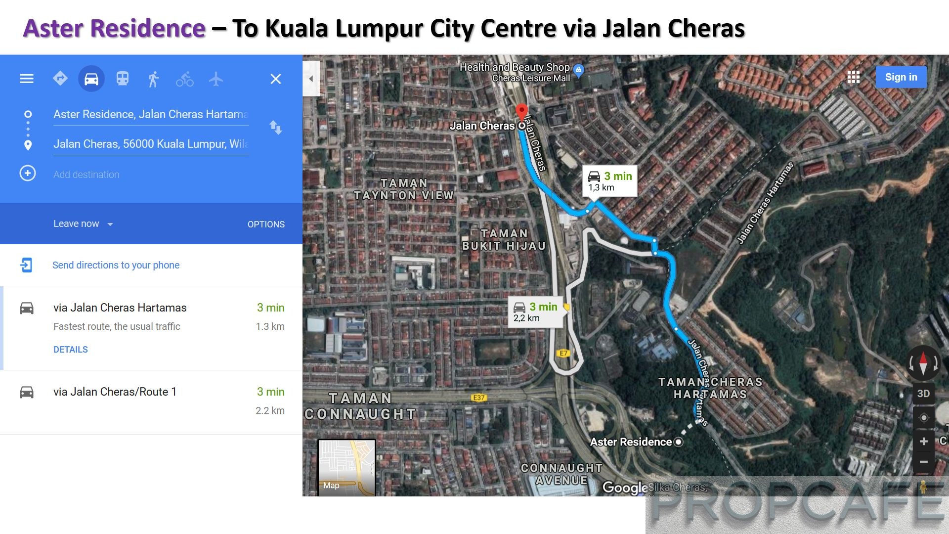 The distance from Aster Residence to Jalan Cheras is about a 1.3km drive (3-5 mins). Please take note that bottle-neck at the T-Junction of Persiaran Lemak – Jalan Manis during peak hour.