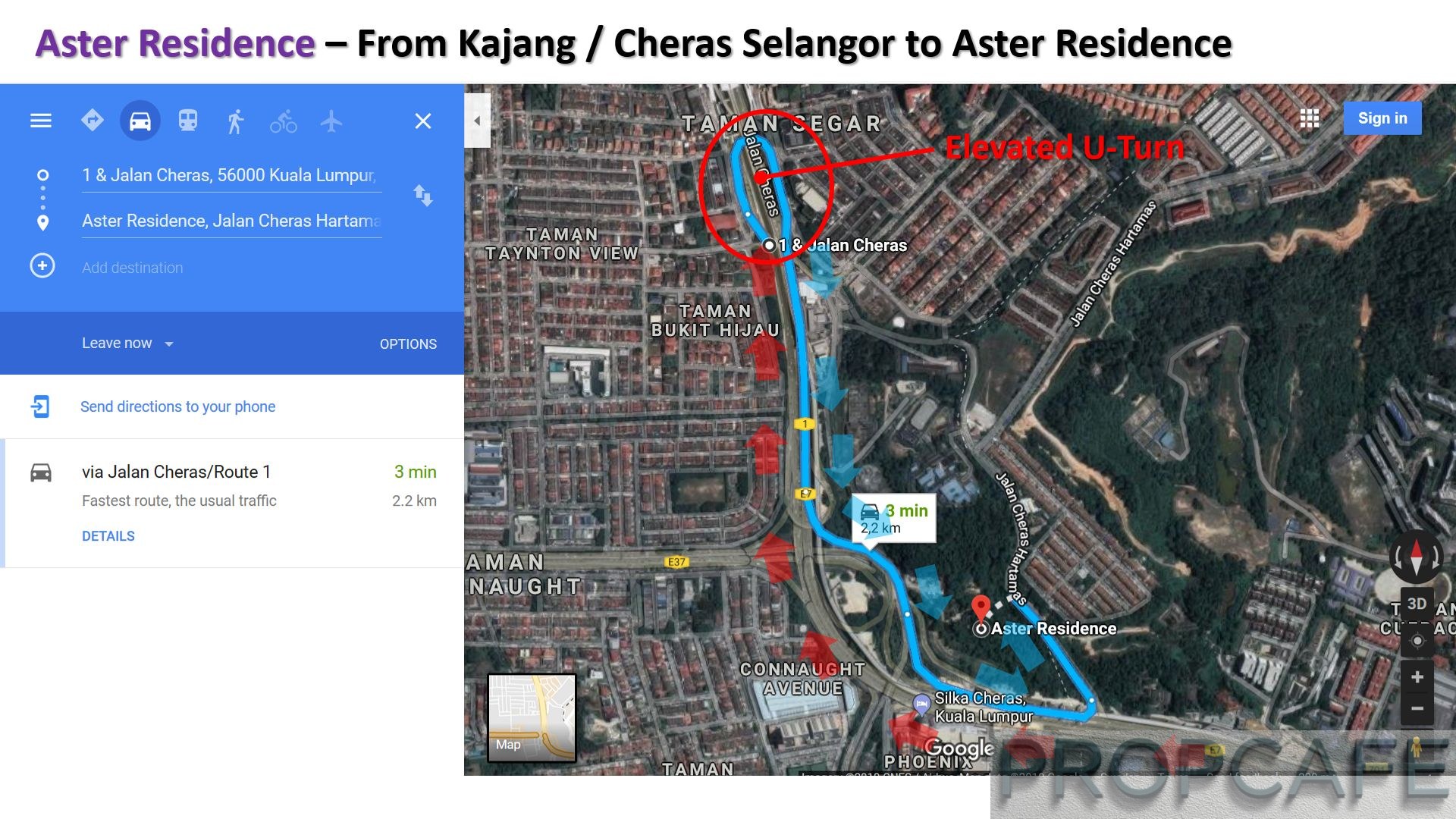 For those who are returning to Aster Residence from Kajang / Cheras Selangor direction via Lebuhraya Cheras-Kajang, there is a dedicated U-turn flyover at Jalan Cheras before the Station MRT Taman Mutiara (Leisure Mall). The journey from this U-Turn flyover to Aster Residence is about 2.2km away (3 to 5 mins) via Jalan Cheras Hartamas