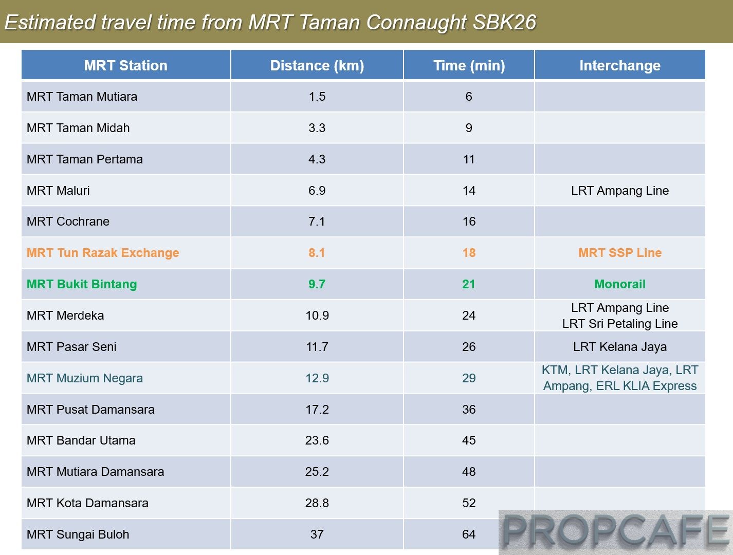 Below is the summary of estimated travel time from Aster Residence via MRT Taman Connaught to other stations.