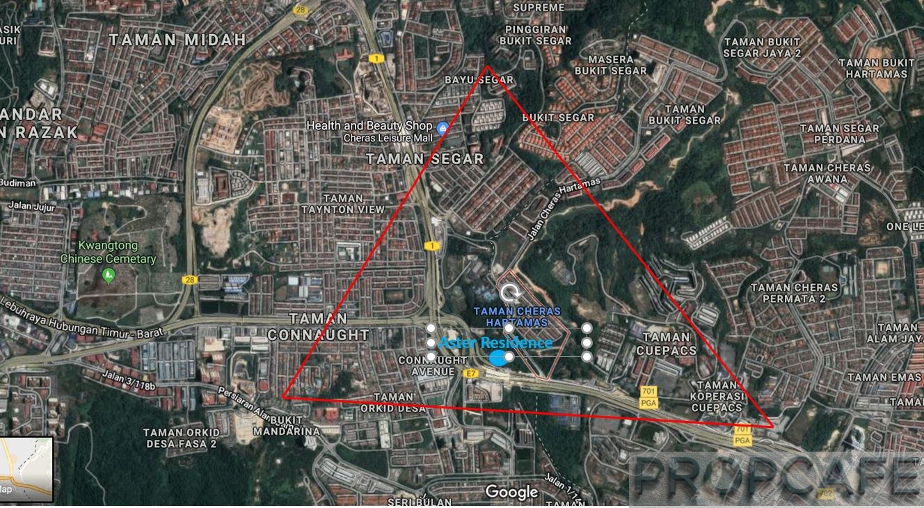 Aster Residence is sitting along Jalan Cheras Hartamas which serves as the daily main access road for its residents. The development land is in between of Taman Cheras Hartamas and MRT Taman Connaught (SBK26). The photo below will explain better than words.
