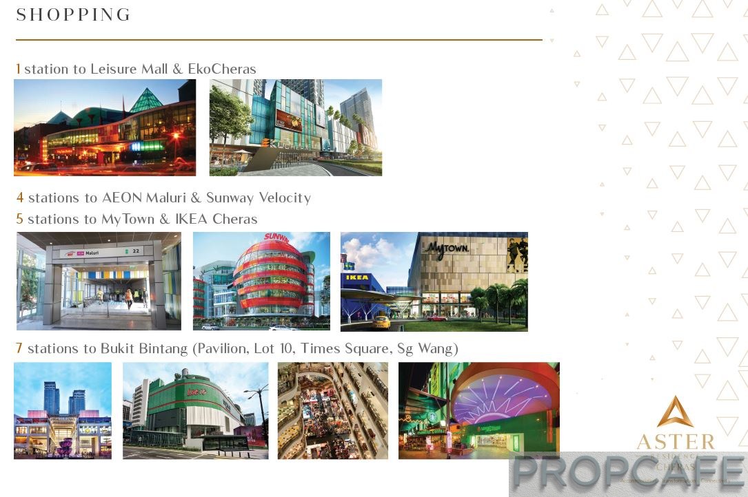 Shoppers can hop in and hop out at MRT Bukit Bintang which is 7 stops away or about 21 mins of travel time (station to station) from Aster Residence.