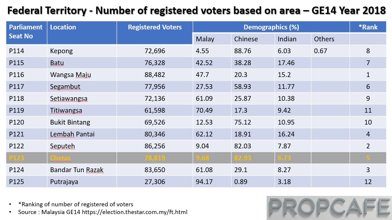Cheras is one of the Top 5 in term of number of registered voters (78,819) in Federal Territories based on the latest statistic obtained during our General Election 14 which happened not so long ago.