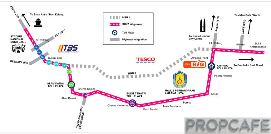 The RM4.63 billion SUKE project from Sri Petaling (where KESAS ends) to Alam Damai, Cheras Hartamas, Bukit Teratai, Taman Kosas, Pekan Ampang, Taman Hillview and ends at Bukit Antarabangsa will be linked to the MRR2, DUKE, AKLEH, KL-Seremban Highway, Cheras–Kajang Highway (Grand Saga), Besraya and Kesas highways. For further reading please click here