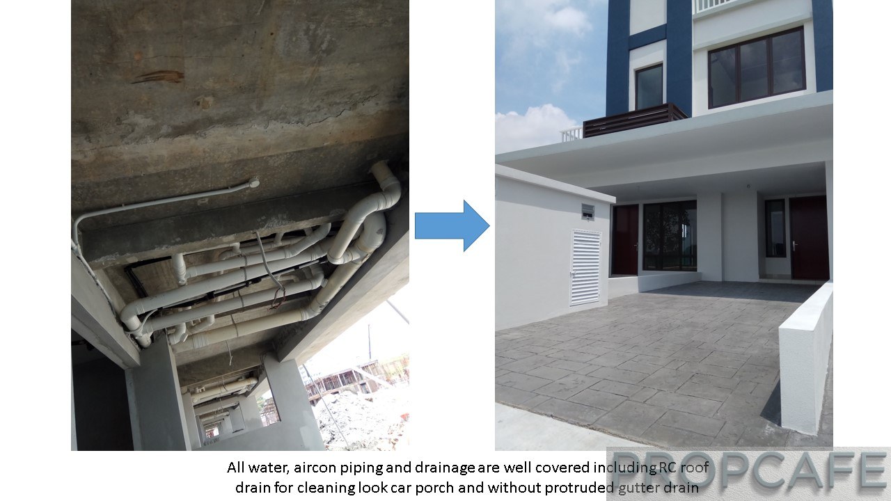 - All water supply, drain and aircon piping are well covered under the RC roof and routed to center pillar for tidier façade without protruding beam.