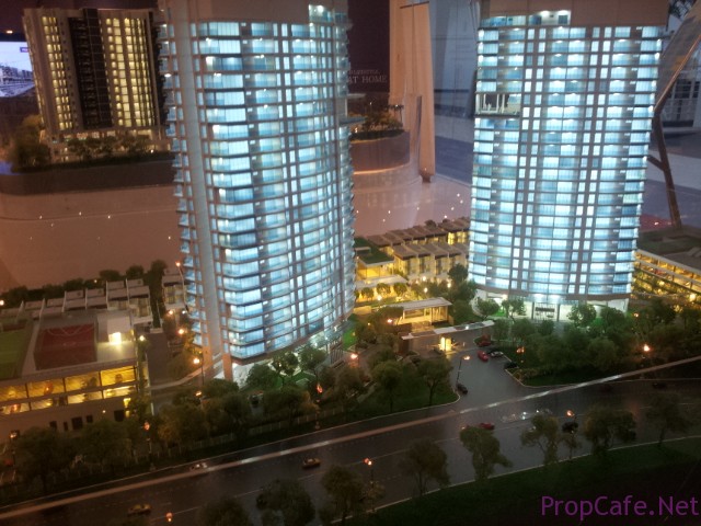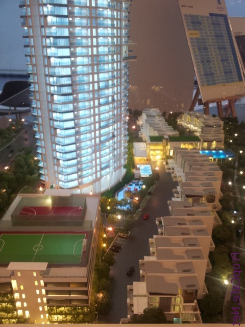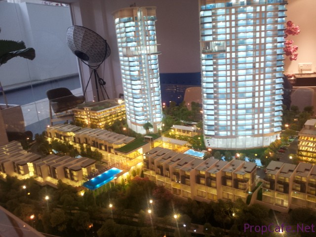 It is CondoVilla concept where the project consists of both highrise (2 blocks) and landed property. There are 350 units condominium with the size from 1302sf (typeA), 1521f (type B corner), 1579sf (type C Corner) and 3189sf (penthouse). All type A, B, and C comes with 3+1 rooms sit on around 11 acres land.