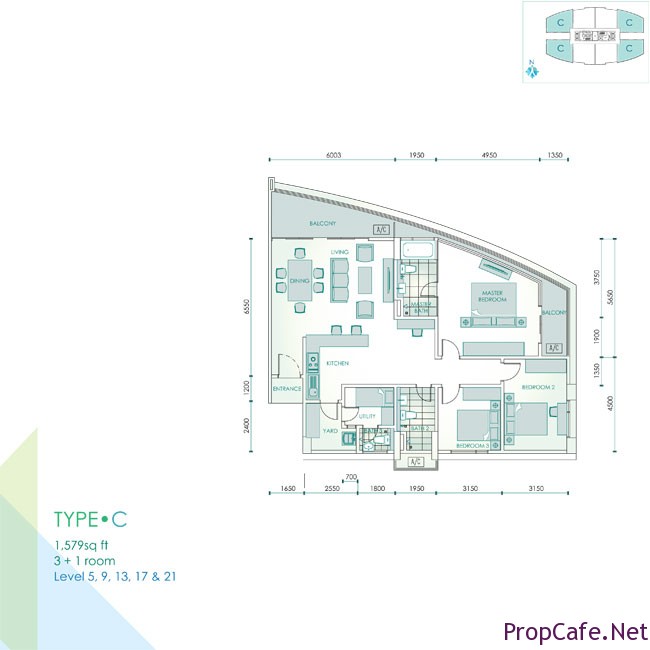 The rest of the layout looks very practical as well with squarish living room (thumbs up). Type B has two balconies and Type C has also two balconies but both can be accessible to each other! Overall, good layout!