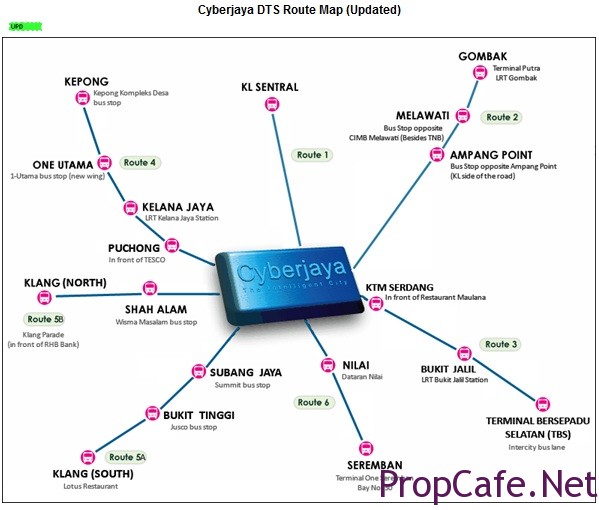 Bus/shuttle service called Dedicated Transportation System (DTS) is available to ferry knowledge workers from the Klang Valley, Seremban, Klang, Gombak and Kepong to Cyberjaya. The bus movement/location and issues are tracked by GPS and GPRS which the schedule will be updated in the website. The DTS serves 7 routes 24/7 and it charges RM213 per customer per month. See the route coverage and the example of the scheduling below. http://www.cyberjaya.name/dts.htm#