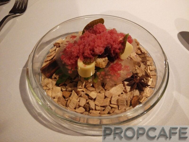 Mulberry Jam, Cardamom Ganache, Cashew Brittles, Pucuk Gajus, Mulberry Snow