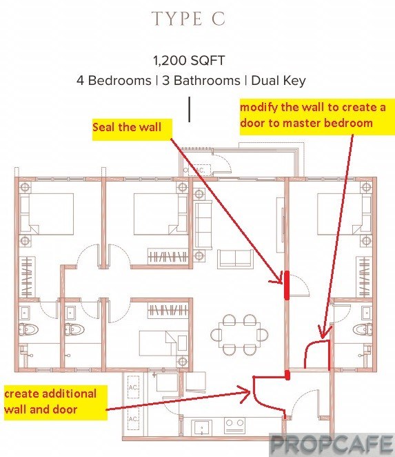 For type C, owner could convert the unit to dual keys concept by renovate the master bedroom wall and add another door leading to the kitchen.
