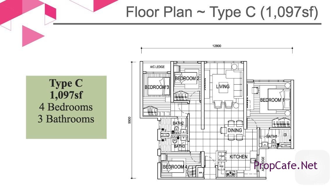 As usual, my gripe about such layouts is the lack of a wet kitchen/yard – for the tenant to do laundry or cooking.  Enclosed kitchen does not really suit Malaysians (your fried ikan kembong, telur mata kerbau, etc will stink up the whole apartment).   Malton has made a commendable effort to squeeze in 4-bedrooms into a 1097sf unit.