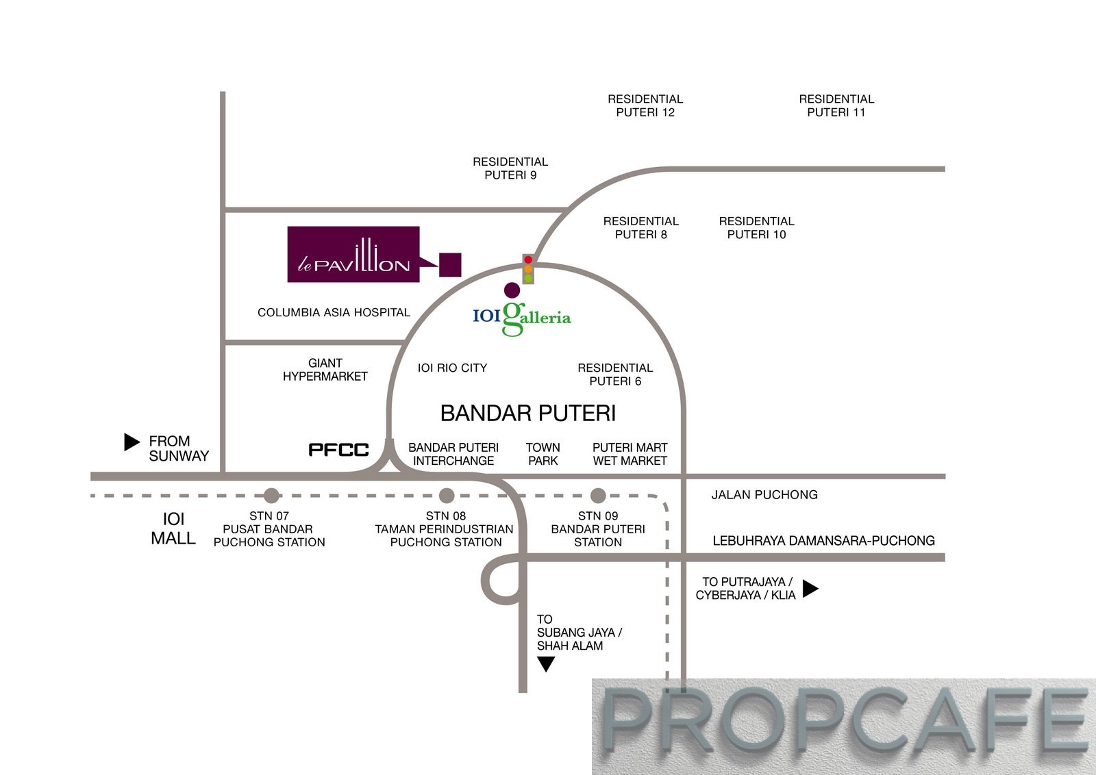 Pavilion Bandar Puteri Puchong is accessible to 7 major highways in Klang Valley namely LDP Highway , Bukit Jalil Highway, Kesas Highway, MEX Highway via Kesas, ELITE Highway via LDP, NPE via LDP, federal highway via LDP.