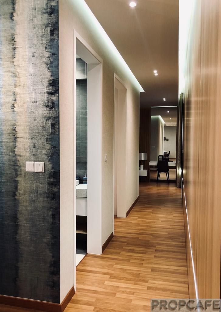 This layout, again, is based on horizontal space design. It tried to optimise the view of the unit to arrange all key sections horizontally. All four bedrooms will get great daylight from the wide windows. The tricky part is on the wet kitchen due to the odd shape. If one moves the fridge to dry kitchen, the full kitchen cabinet at one end of the wet kitchen should be sufficient and make the space in the kitchen more comfortable.
