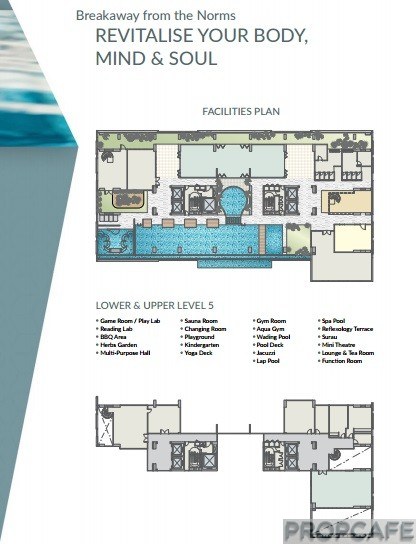 The double volume facility floor offers extensive facilities with the consideration for all age group of residents. For unconventional aqua gym and reflexology terrace will be perfect for elderly to have less hectic gym activities and the reading lab, game room and wading pool are great for kids. The adult can enjoy the spa pool, tea lounge and mini theater and host parties at the mezzanine floor. See the rest of facilities below.
