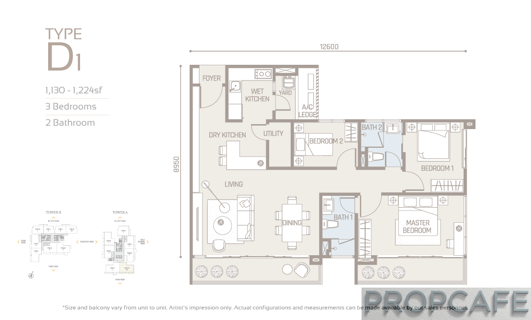 Type D & D1 first comes with expansive living, expansive masterbed room, a good size balconies, and unobstructed park view. However each unit only has 2 bathrooms and bedroom 2 looks too small.