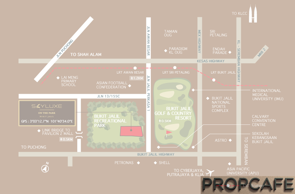 **See above we have highlighted nearest way to Pavilion Bukit Jalil will be via the Pedestrian cross from Bukit Jalil City to Bukit Jalil Recreational park, meaning Skyluxe residents are required to walk pass the park, then only can sampai the mall.