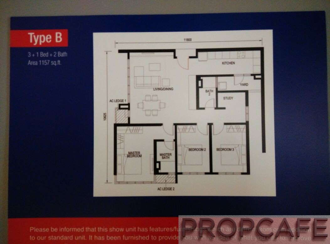 During the media sneak preview, only the Type B 1157sf layout was available and the show unit visited is based on the 1157sf layout. All residential units come with minimum of 3-4 bedroom type.