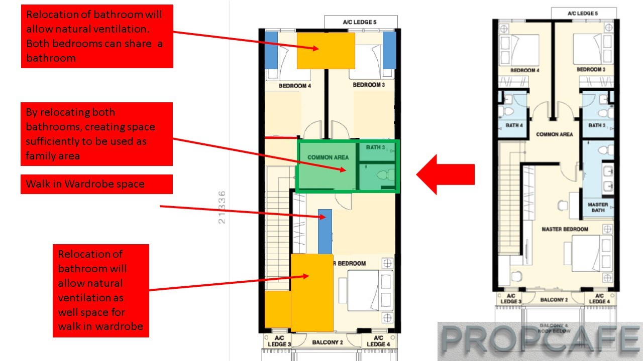 The master bedroom comes with space for walk in wardrobe and standing balcony. PropcafeTM feels the layout can be improvised for example by relocation the bathroom to front and rear of the house, the bathroom will enjoy natural ventilation.
