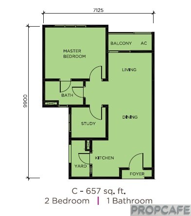 Type C – 657 sqft (Length 32.5ft; Width 23.4ft)