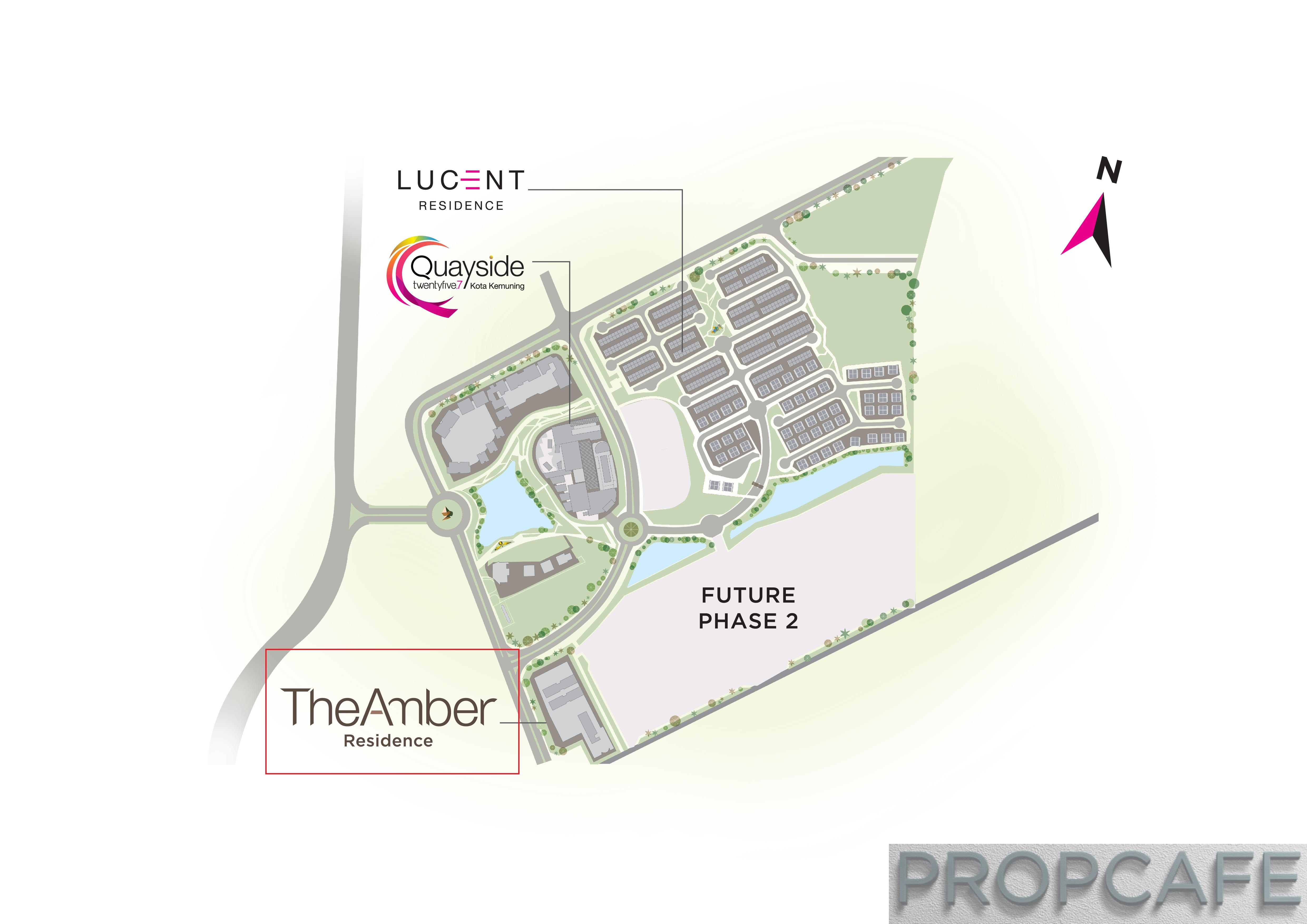 The Amber Residence has two distinct views based on its orientation – (a) North West View (NW- red in picture below) towards Quayside and lake; and (b) South East (SE) View towards future IJM project.