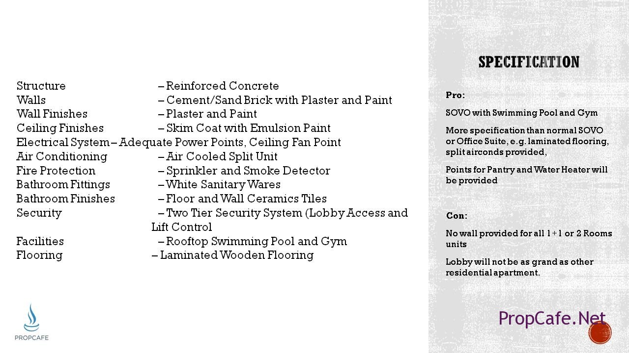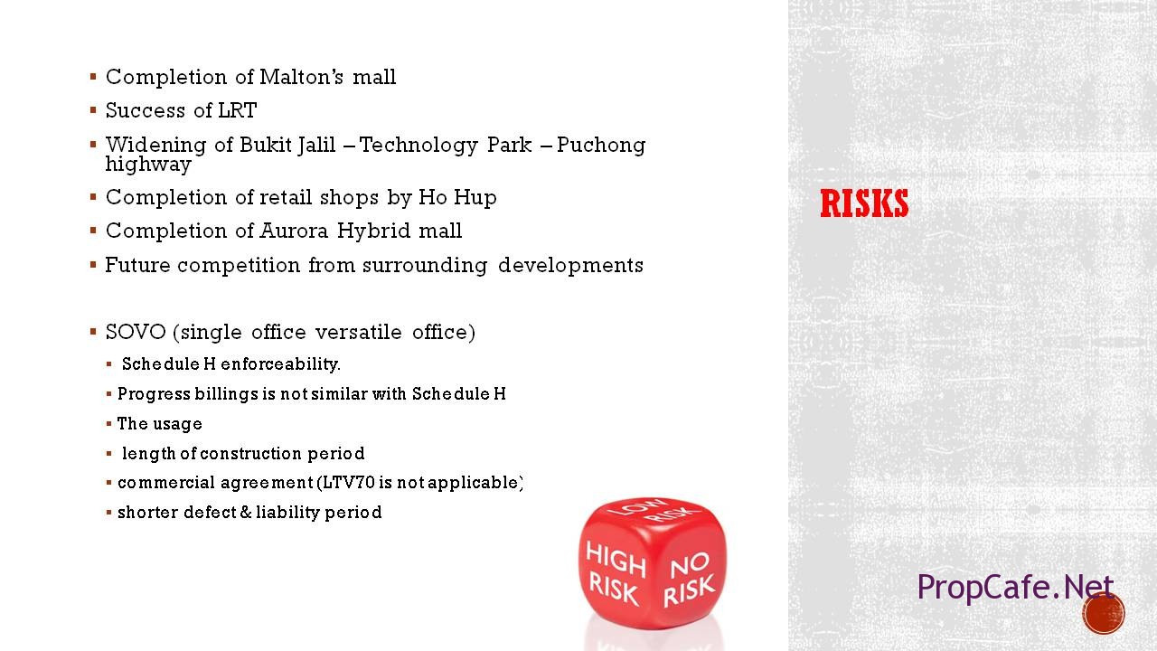 The brief first comparison was made with those comparable products in Klang Valley and second comparison was for Bukit Jalil Area. However we couldn’t find similar product to be compared with exception of the Aurora SOVO that already briefed in earlier slides. therefore the comparision was made with residential products in Bukit Jalil.