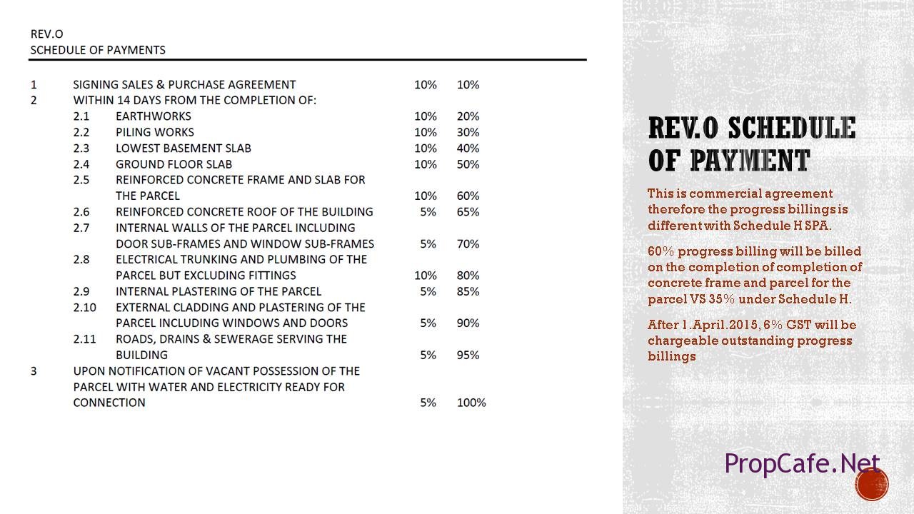 - 60% progress billing will be billed on the completion of completion of concrete frame and parcel for the parcel Vs 35% under Schedule H.