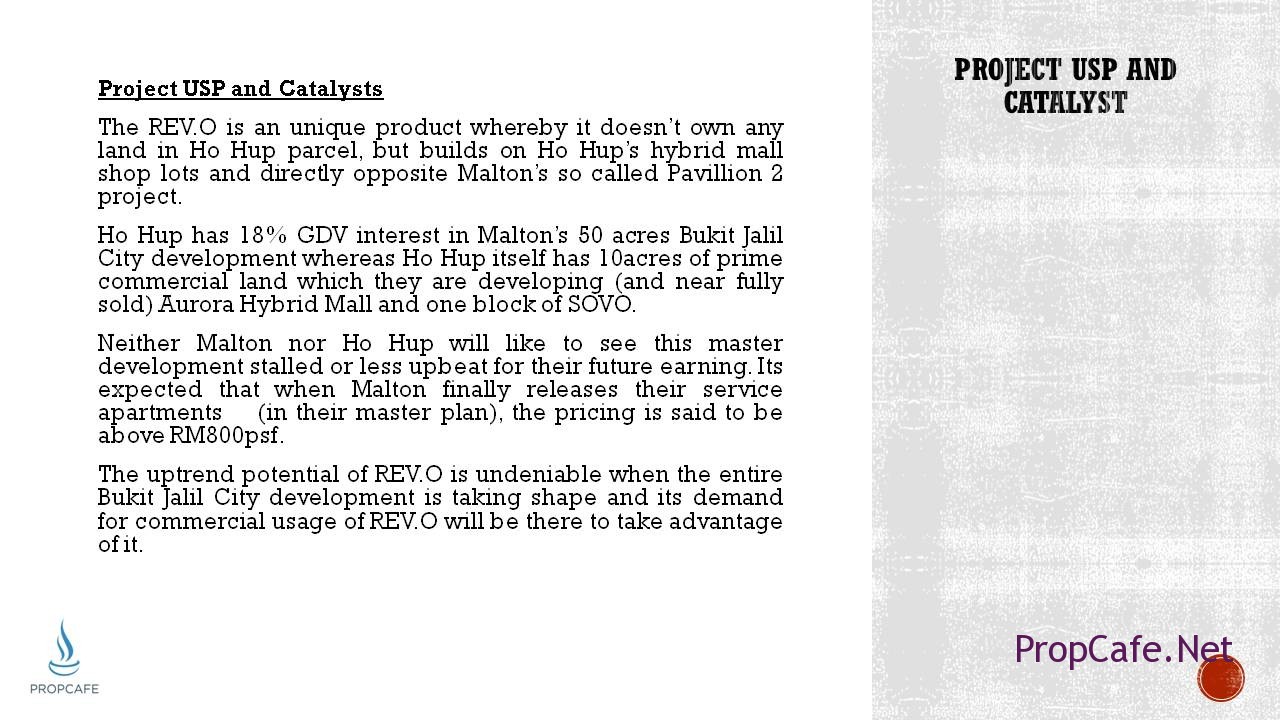 - The REV.O is an unique product whereby it doesn’t own any land in Ho Hup parcel, but builds on Ho Hup’s hybrid mall shop lots and directly opposite Malton’s so called Pavillion 2 project.