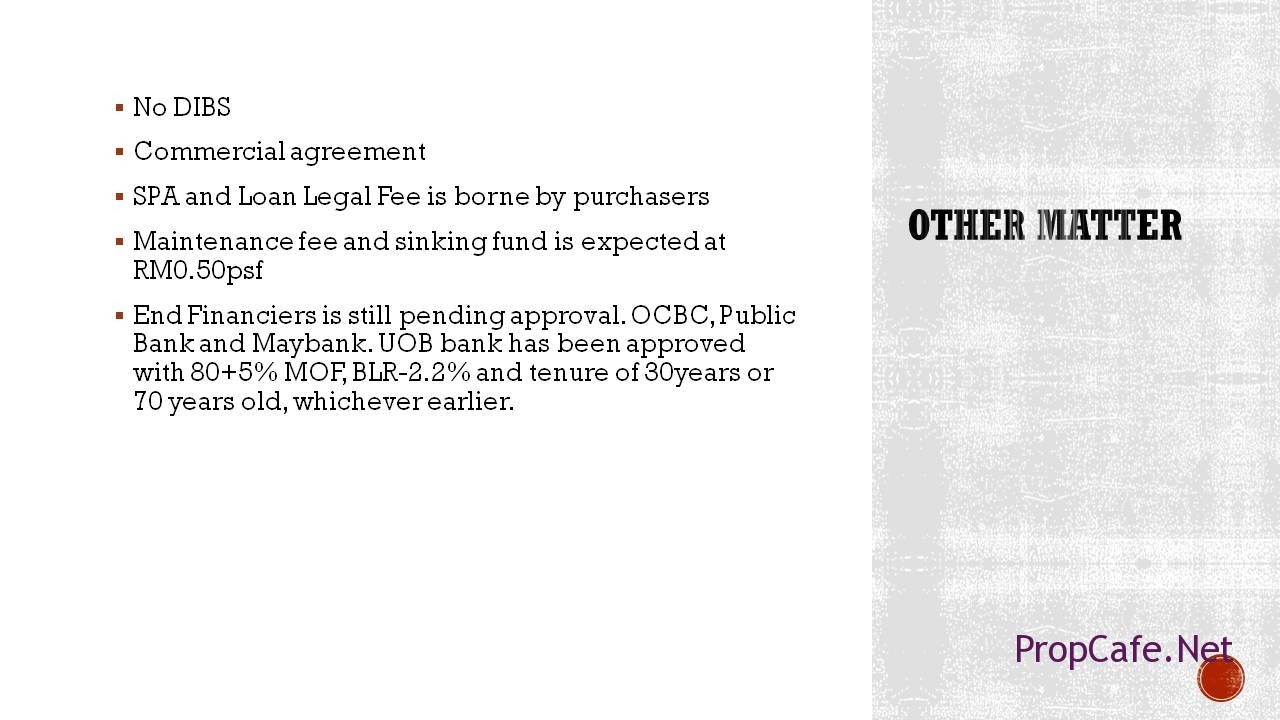 - End Financiers is still pending approval. OCBC, Public Bank, RHB and Maybank. UOB bank has been approved with 80+5% MOF, BLR-2.2% and tenure of 30years or 70 years old, whichever earlier.