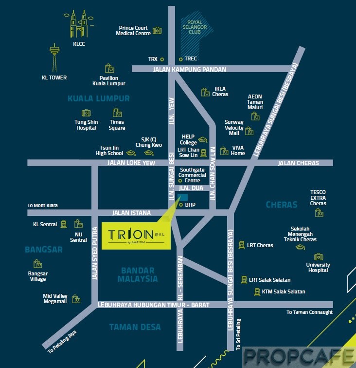 The arteries leading to KLCC such as Jalan Mahameru from West, Jalan Kuching from North, Jalan Ampang from East and Jalan Loke Yew/ Sungai Besi from the south are bringing thousands (if not millions) of cars into KL City on daily basis. Obviously being such prominent spot offer attraction to acquire available land. For example in 2007 MahSing bought a 4.76 acres land along Jalan Sungai Besi for RM52mil which developed to what we know today as SouthGate. In July 2015, Binastra has acquired the 4.07 acre freehold land which used to house Volkswagen Show Gallery for RM96m. For more details clicks the link here. Recently Binastra has pre-launch the development, Trion. Read on for PROPCAFE™ Review.
