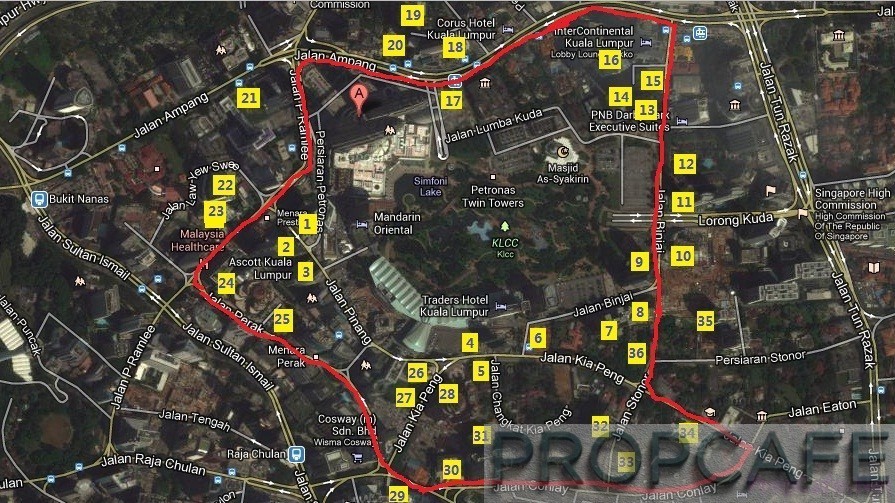 Ampang-KL Highway (partial), Jln Sultan Ismail (partial), Jln P Ramlee (partial), Jln Raja Chulan (partial), Jln Bukit Bintang (partial), and Jln Tun Razak (partial)