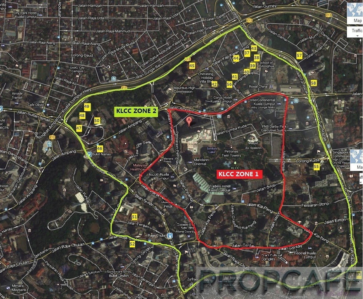 Firstly, PropCafe would like to define “KLCC Properties” as “The properties that surrounding Kuala Lumpur Petronas Twin Towers”. In order to differentiate KLCC Premium Properties from Kuala Lumpur City Center Properties (which can be a very big coverage), PropCafe has studied land’s premium, distance, and surrounding roads of Petronas Twin Towers and finally came out two zones, namely KLCC Zone 1 and Zone 2. Those outside these two zones, unfortunately, PropCafe will not view it as KLCC properties but Kuala Lumpur City Center’s Properties