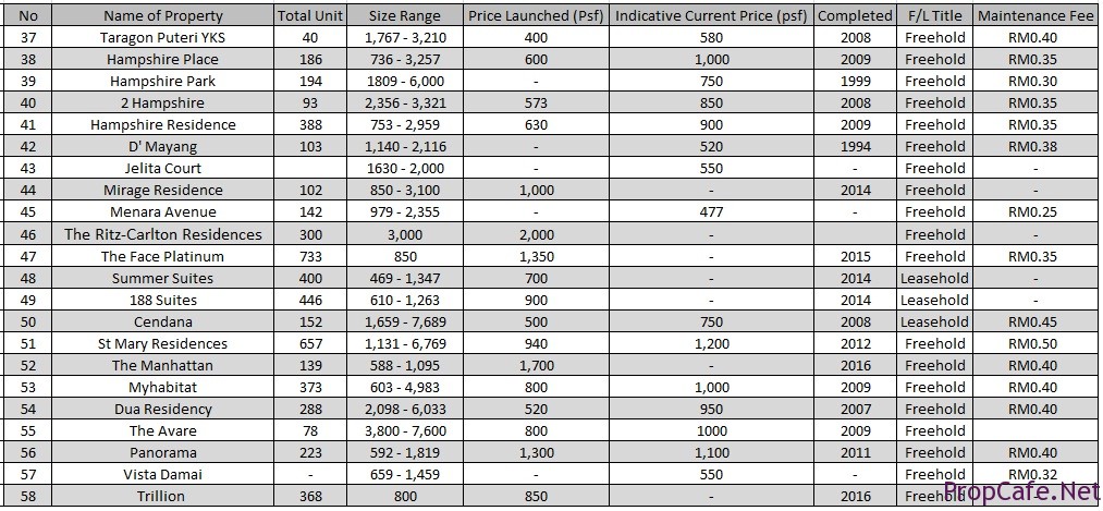 PropCafe is also happy to share the consolidated information of the “KLCC Properties” (with two different category i.e. two different zones). PropCafe will try its very best to update this information as frequent as possible. Bear in mind that we are not valuers or real estate agents, so kindly re-confirm the information from a qualified valuer, especially on the “the current indicative price” of the properties below.